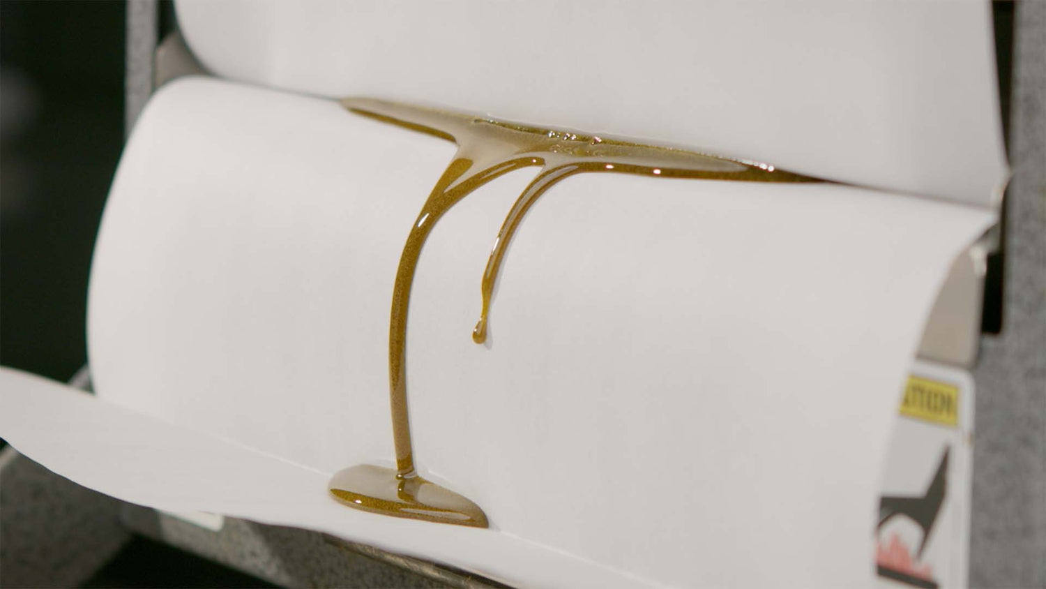 Di qui arriviamo alla pressatura, che ci consente di separare l'estratto dalla sua parte cerosa: le capsule dei tricomi. Lo facciamo attraverso una filtratura selettiva per pressione, a calore controllato. Questo particolare processo viene anche definito rosintech e rappresenta un'avanguardia nella lavorazione della cannabis.